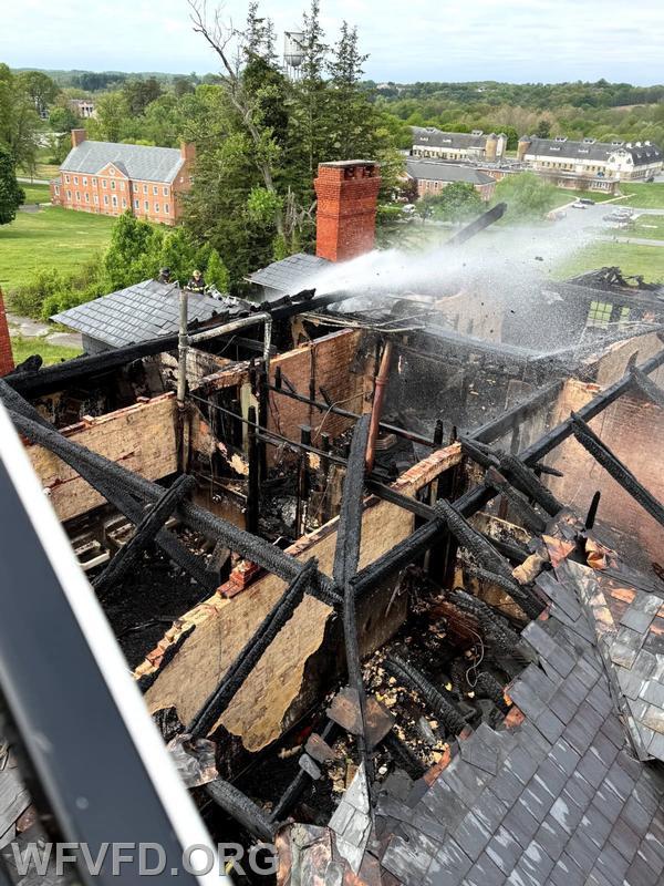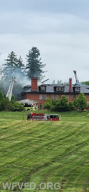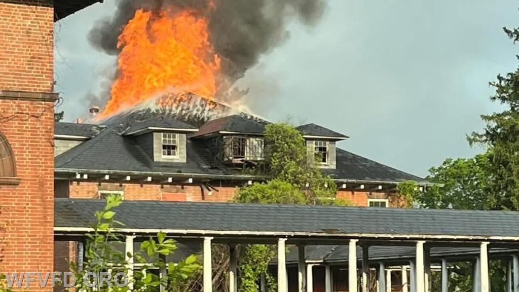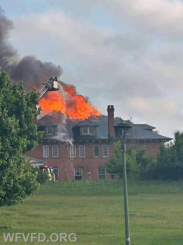 At 07:27 this morning units from the West Friendship Volunteer Fire Department were dispatched to a building fire in Carroll County at the Springfield Hospital Center, located at 1121 Main Street. Crews from the Sykesville Freedom District Fire Department arrived at the scene and found fire visible through the roof of a vacant building on the property. Firefighters initiated a defensive operation using elevated master streams from Tower 12 and Baltimore County Truck 18. While units were operating, a second building nearby was noticed to have smoke showing; a small fire inside was quickly extinguished by crews already on scene.