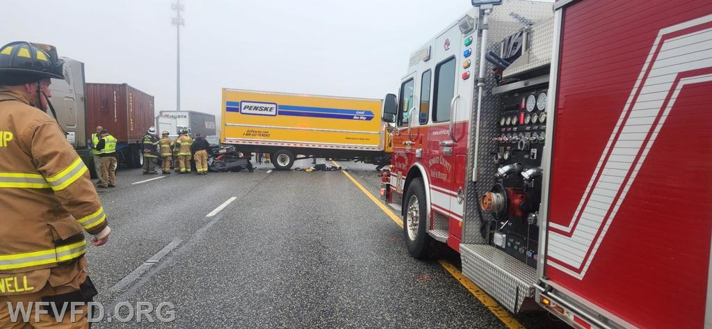 Following the funeral services for President Roles, as the repass was concluding, the tones sounded for a rescue involving injuries on I-70 near Route 32. Callers reported that a vehicle struck a parked tractor-trailer, overturned, and collided with a box truck. Units arrived at eastbound I-70 near the Fairgrounds and found three patients requiring transport with no entrapment. Two patients were transported to the R Adams Cowley Shock Trauma Center in Baltimore and one patient was taken to Howard County General Hospital. New Midway Volunteer Fire Company Engine 91 from Frederick County, which attended the funeral of President Roles, responded to the call alongside WFVFD and other units.